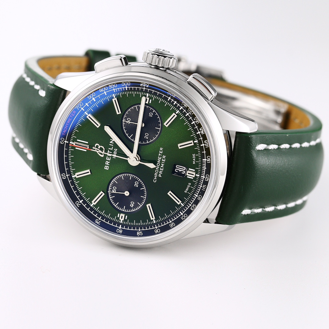 | Breitling Premier 42mm Green Black Dial Steel Bezel Green Leather Strap AB0118A11L1X1 | |