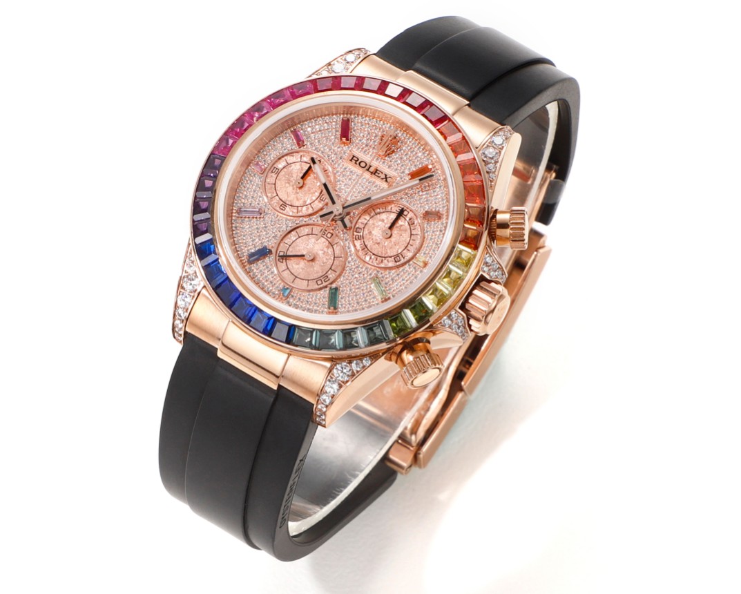 | Rolex Daytona Rainbow 40mm Diamond Dial Rose Gold Diamond Bezel Black Rubber Strap 116595RBOW-0004 | |