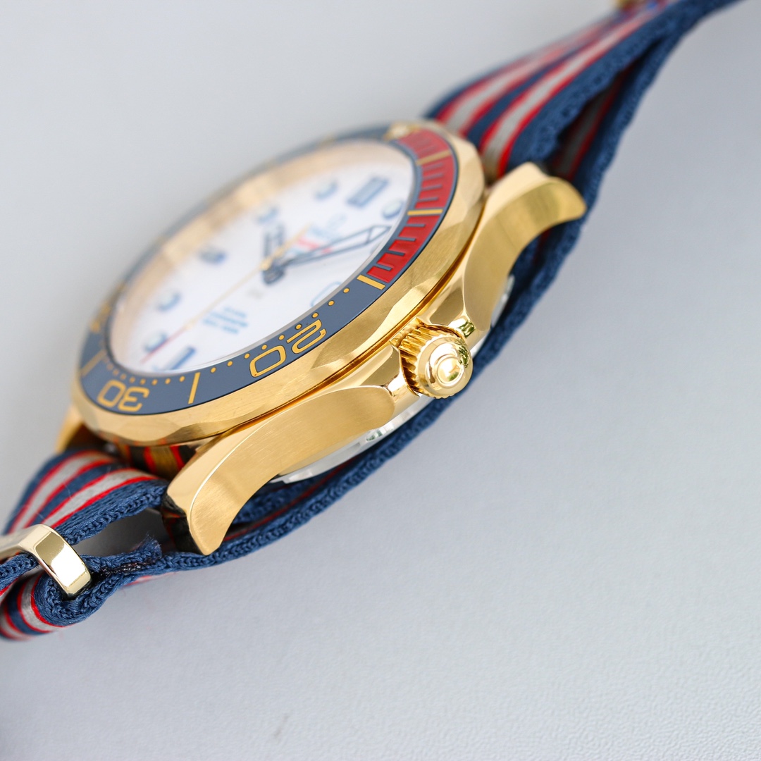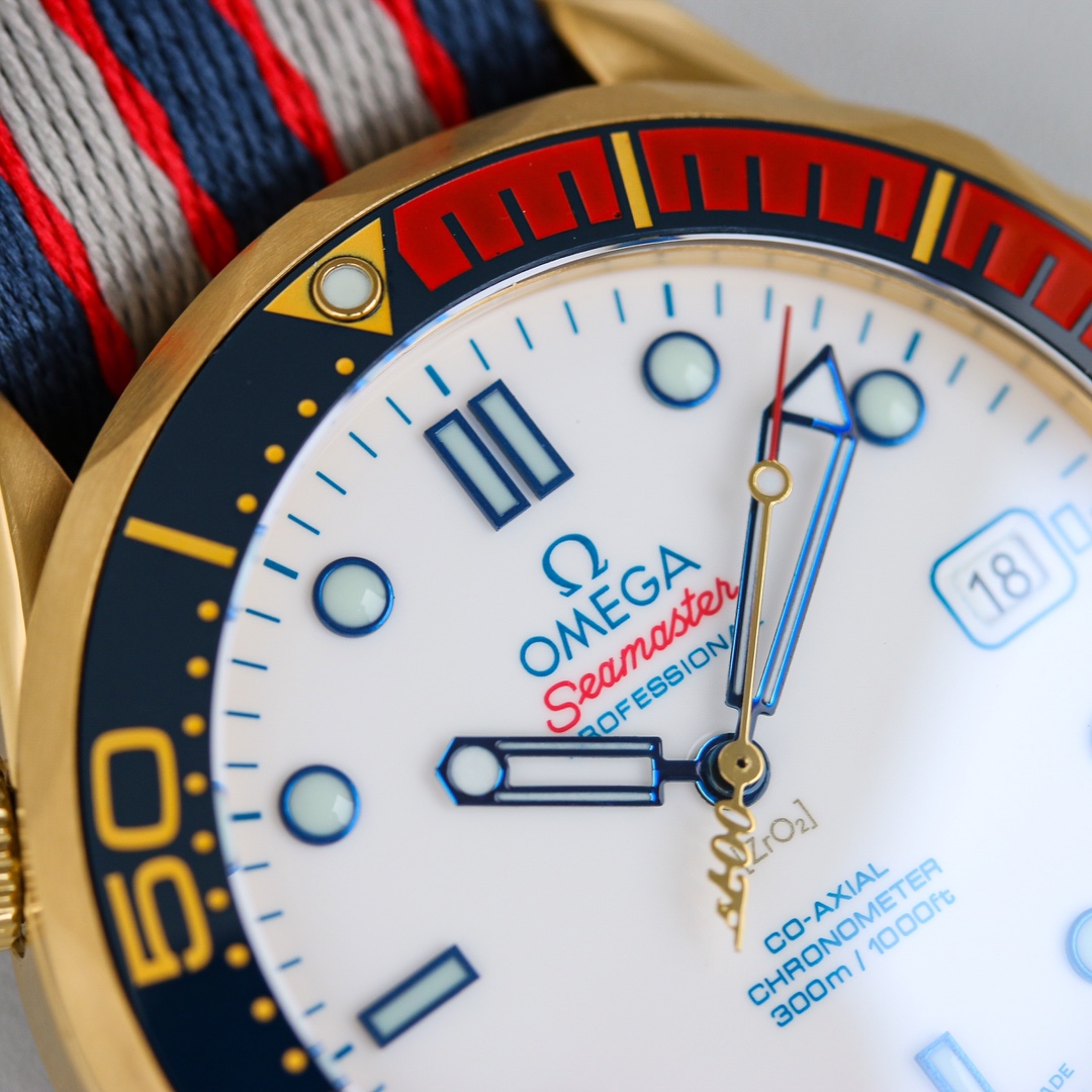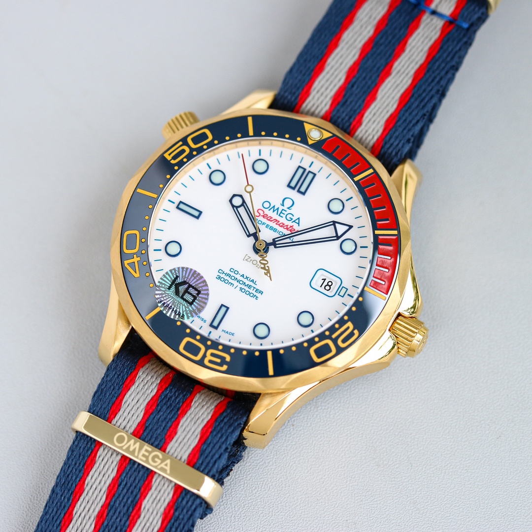| Omega Seamaster Diver 300M 41mm White Dial Red Blue Gold Bezel Red Grey Blue Fabric 212.62.41.20.04.001 | |