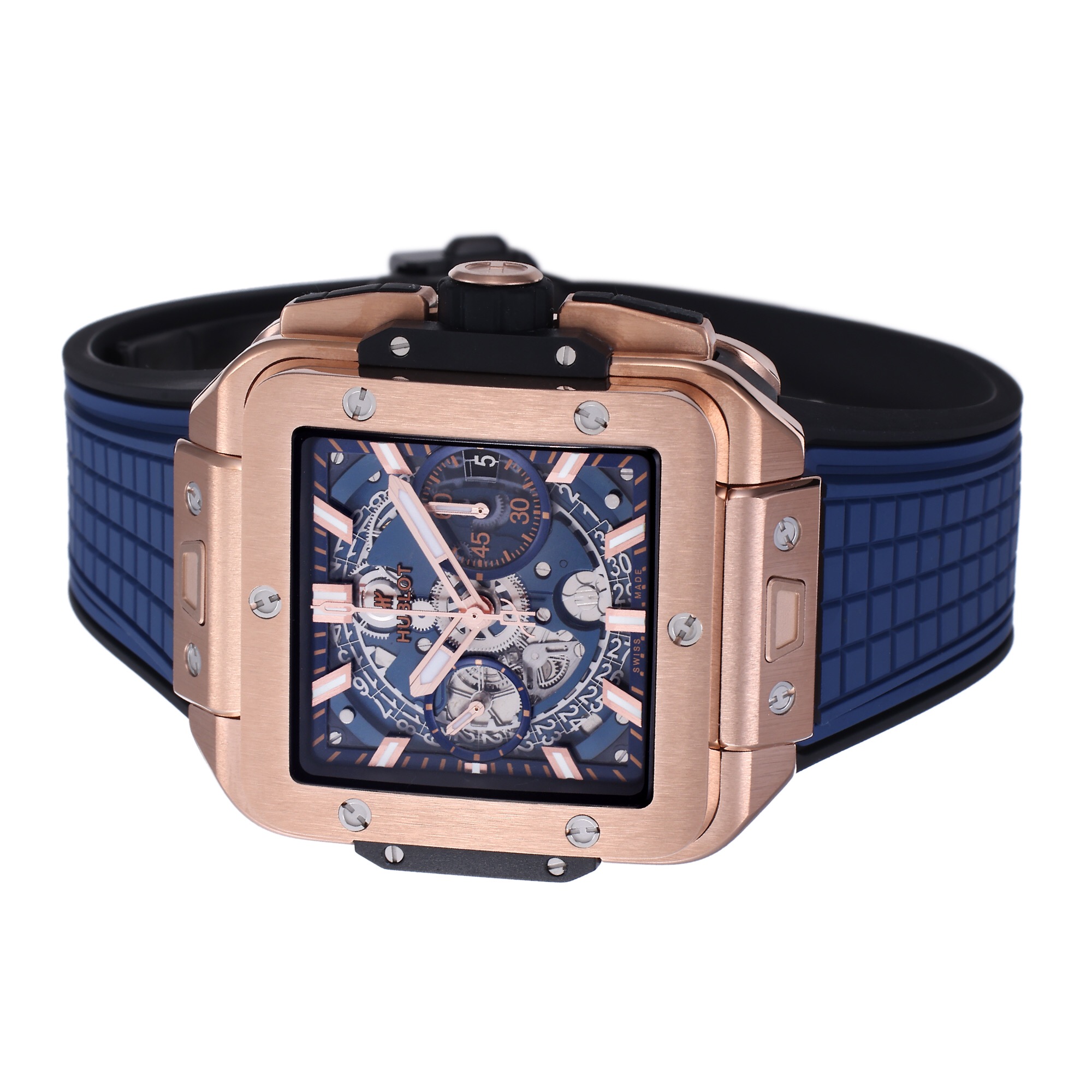 Hublot Square Bang Unico 42mm Grey Dial Rose Gold Bezel Blue Rubber Strap 821.OX.5180.RX
