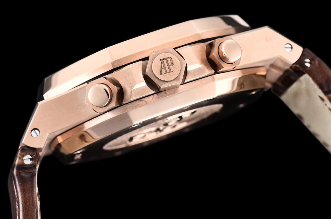 | Audemars Piguet Royal Oak Chronograph 41mm White Dial Rose Gold Bezel Brown Crocodile Strap 26331 | |
