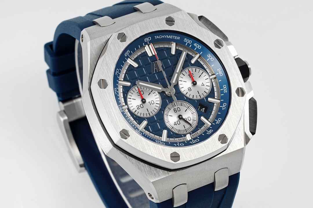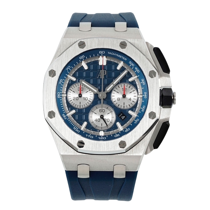 | Audemars Piguet Royale Oak Offshore Chronograph 43mm Blue Silver Dial Steel Bezel Blue Rubber 26420TI.OO.A027CA.01 | |