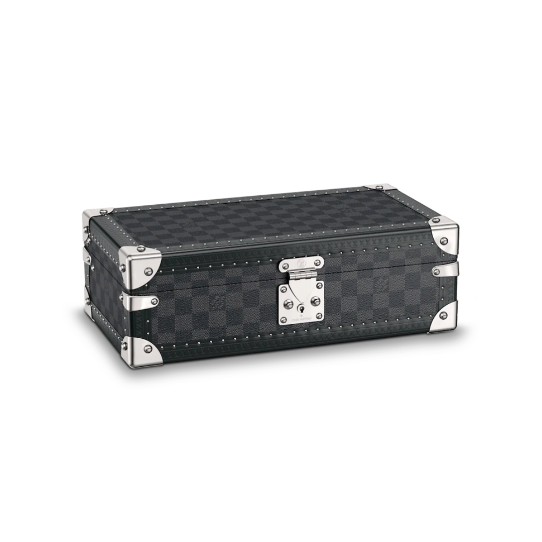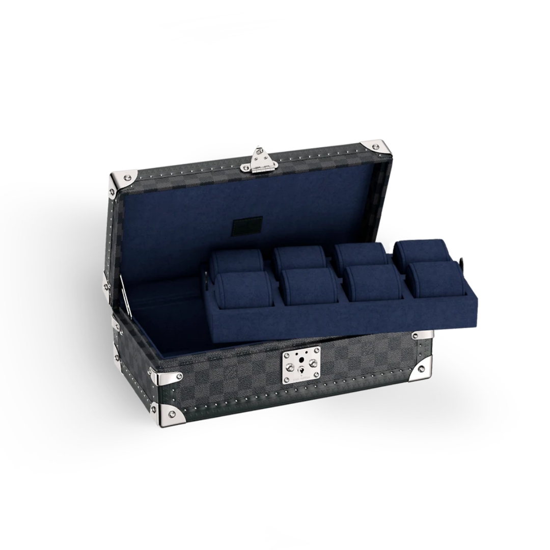 This 8 watch case is crafted in classic Damier Graphite canvas.