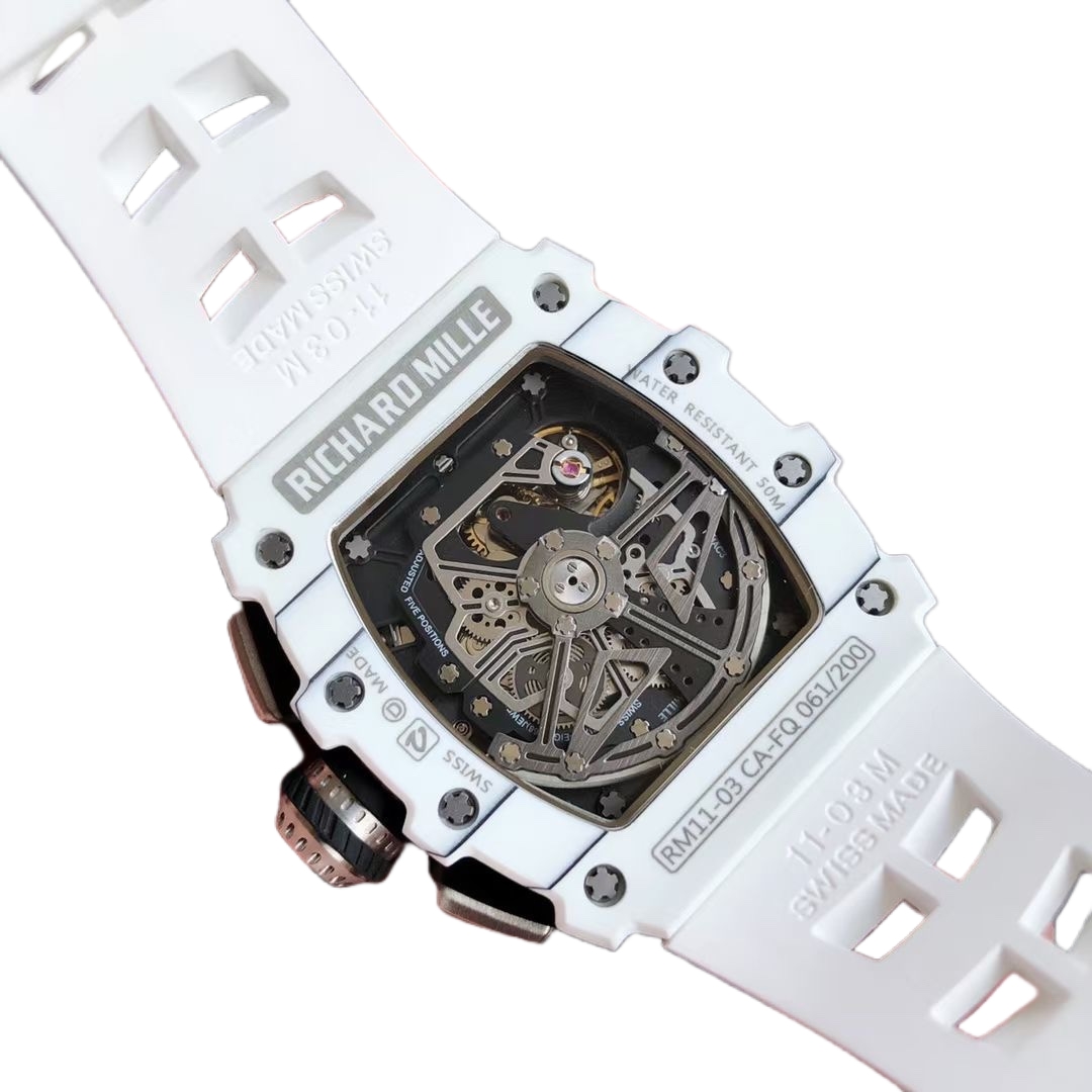 | Richard Mille RM 11-03 49.94mm x 44.50mm Dial White Carbon Fiber Bezel White Rubber Strap | |