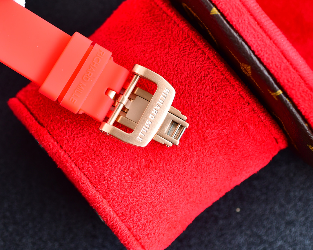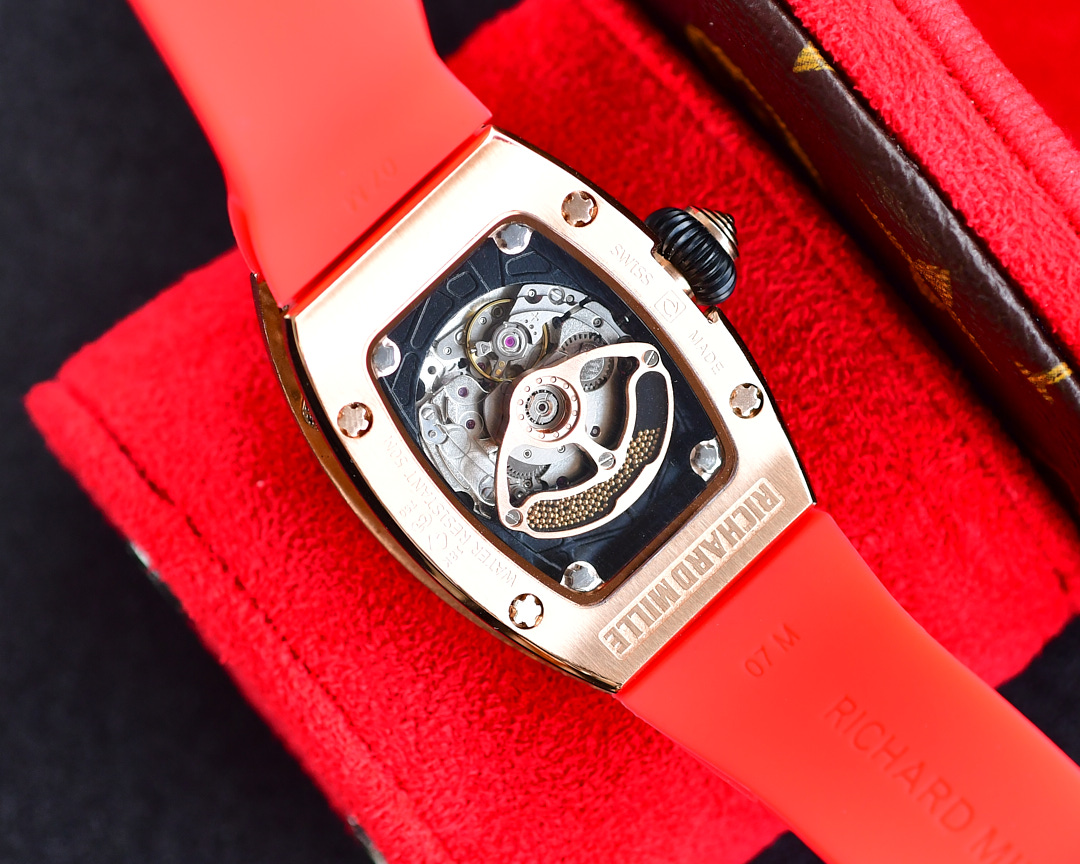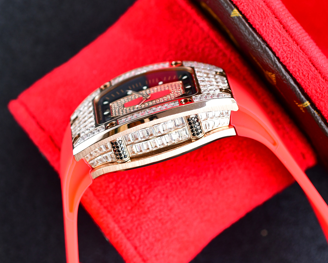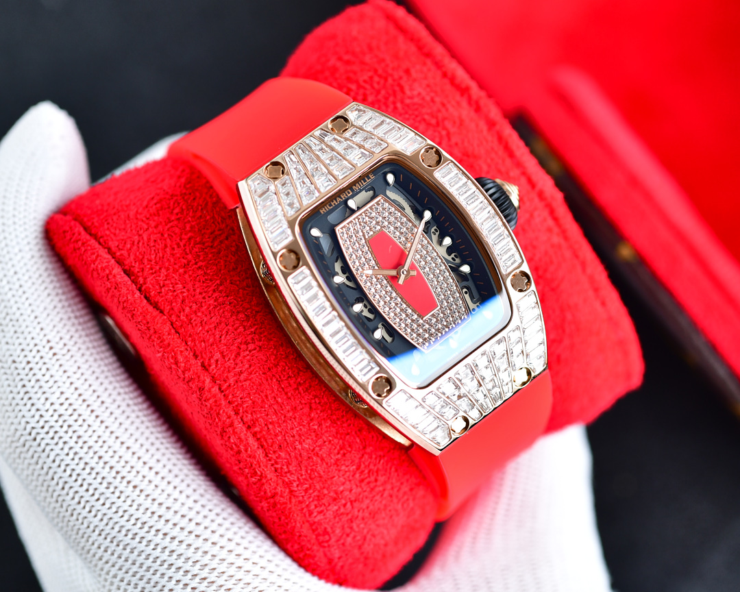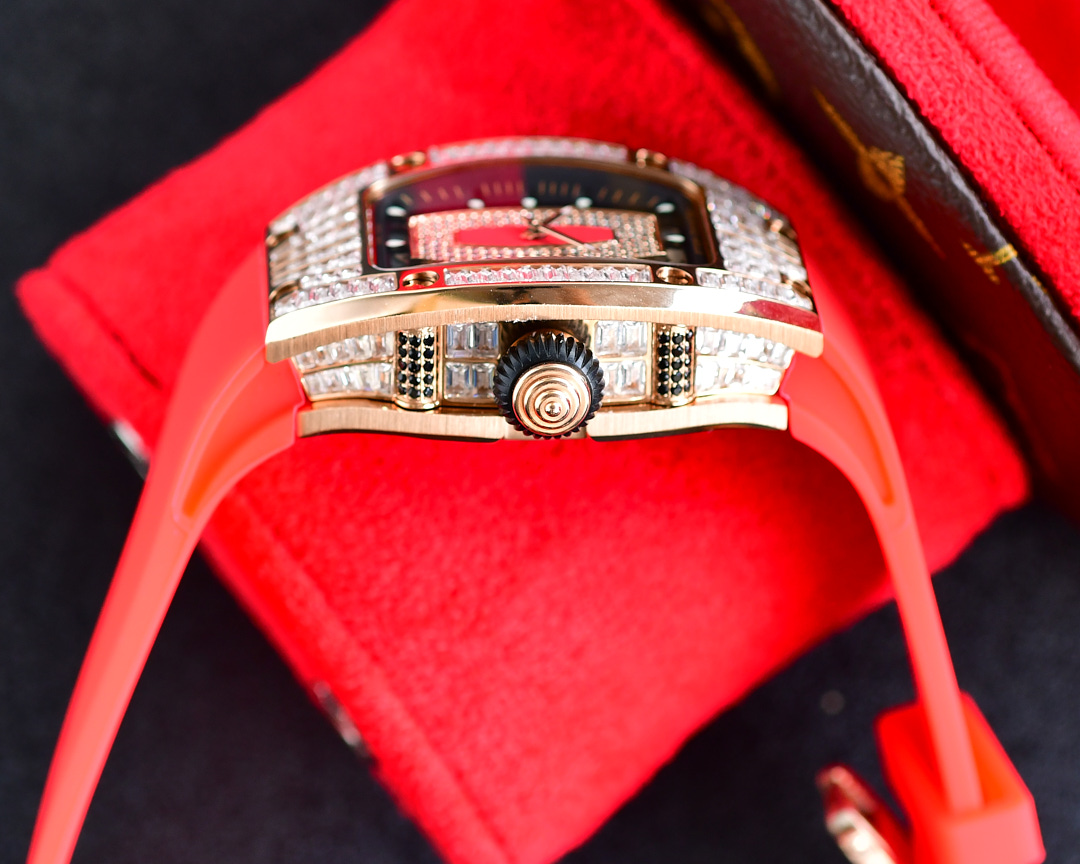 | Richard Mille RM07-01 45.66mm x 31.40mm Diamond Red Dial Rose Gold Square Diamond Bezel Red Rubber Strap Ladies Woman | |