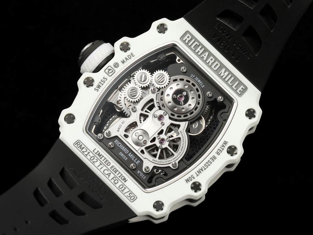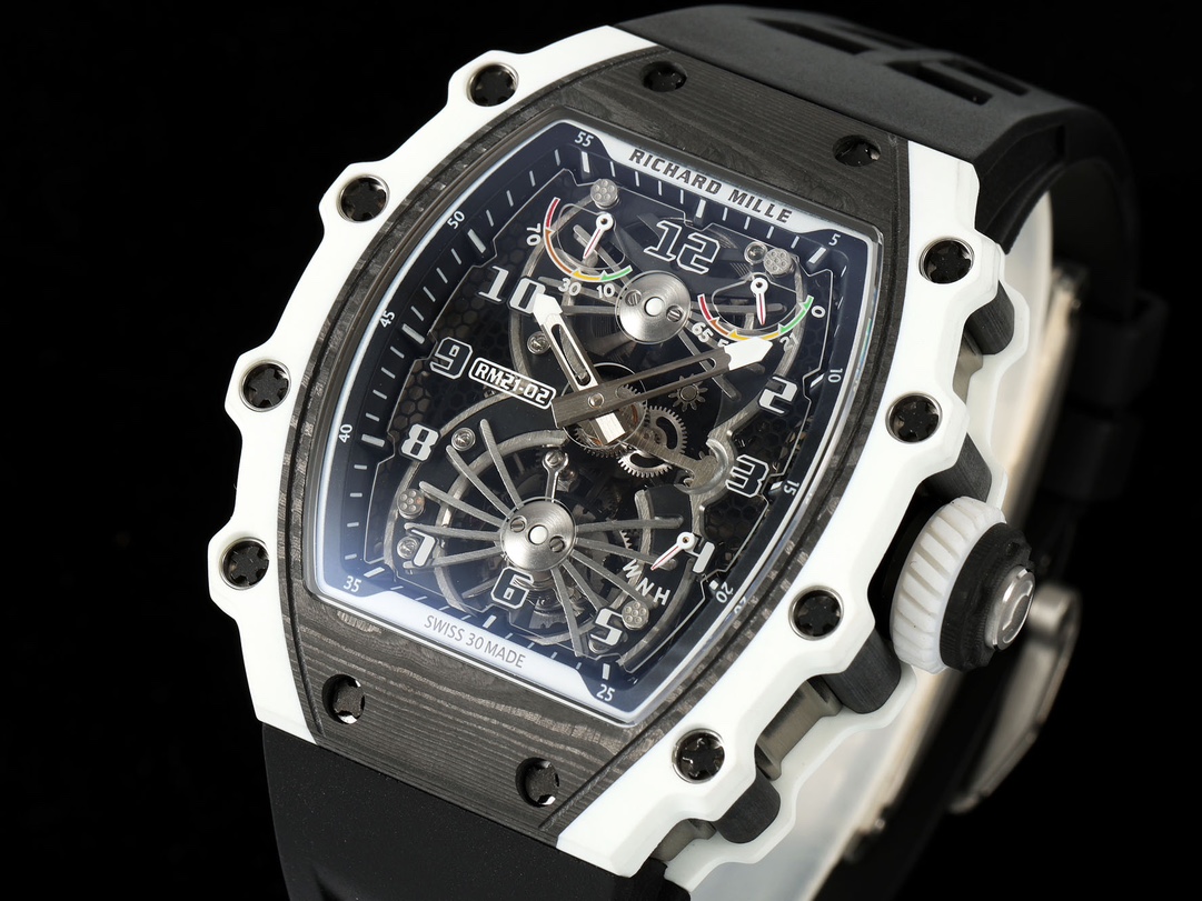 | Richard Mille RM21-02 Ti CA FQ 42.68mm x 50.12mm Grey Dial Black White Ceramics Bezel Black Rubber Strap | |