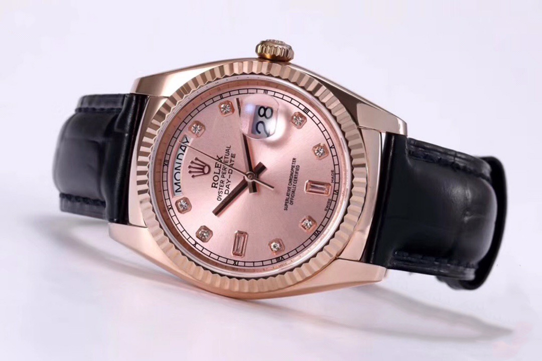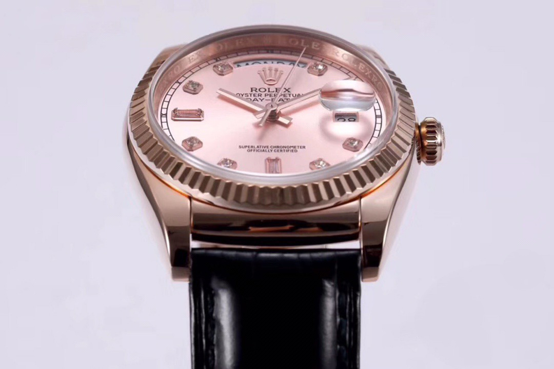 Rolex Day-Date 36mm 40mm Dial Pink Diamond Rose Gold Black Leather 118135-0101