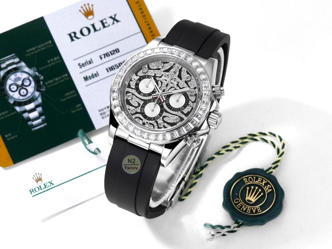 | Rolex Daytona 40mm Diamond Dial Steel Diamond Bezel Black Rubber Strap 116588TBR Eye of the Tiger | |